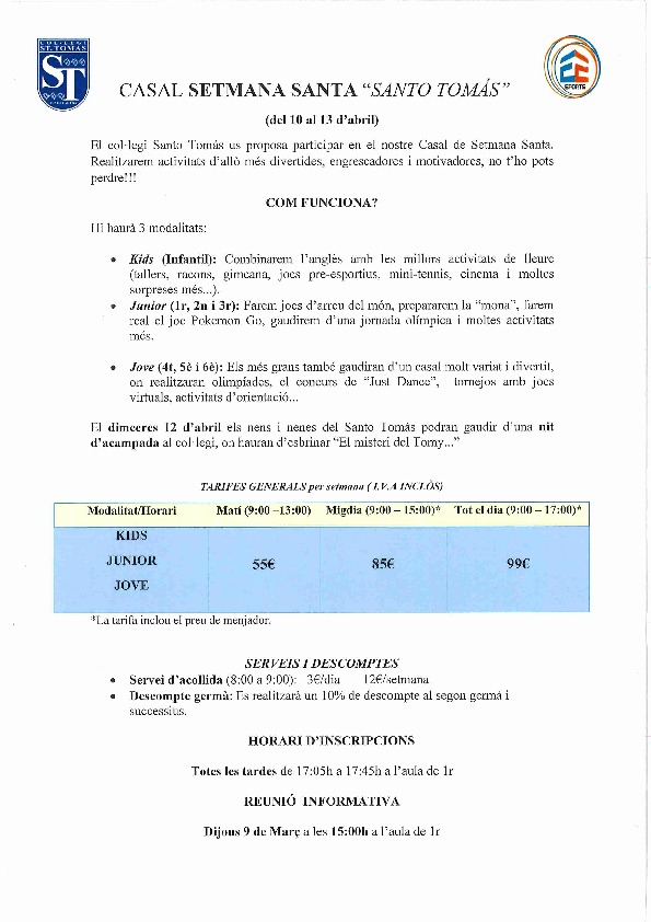 Ja podeu fer la vostra inscripció al Casal de l´escola per Setmana Santa, del 10 al 13 d´abril.